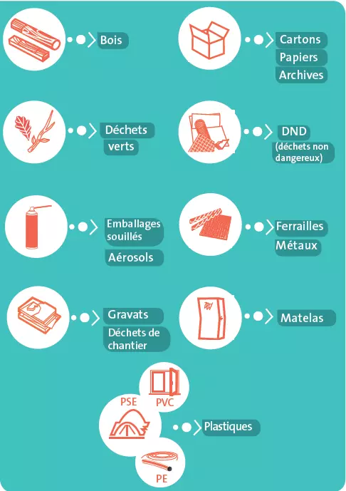 Acceptés : Bois, Cartons/Papiers/Archives, Déchets verts, Déchets Non Dangereux (DND), Emballages souillés/aérosols, gravats/déchets de chantier, matelas, métaux/ferrailles, plastiques